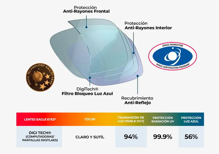 - Lentes DigiTec para luz azul digital: Bloquean la luz azul de dispositivos electrónicos, reducen fatiga visual y cansancio por pantallas.